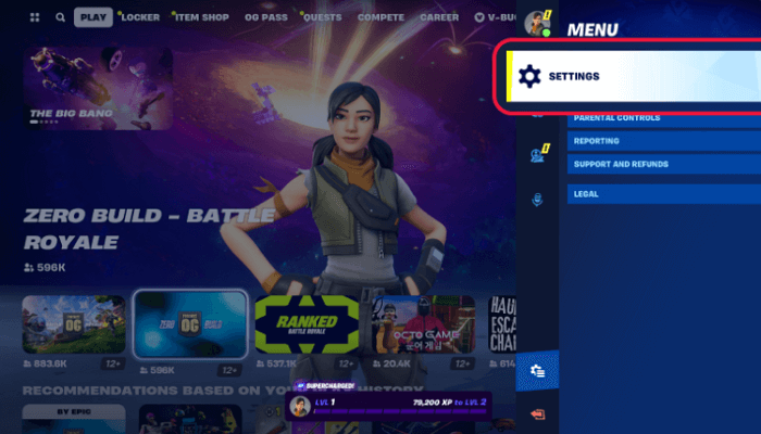 步骤1。在您的设备上打开 Vozard。现在启动 Fortnite 并单击其主页上的“设置”。