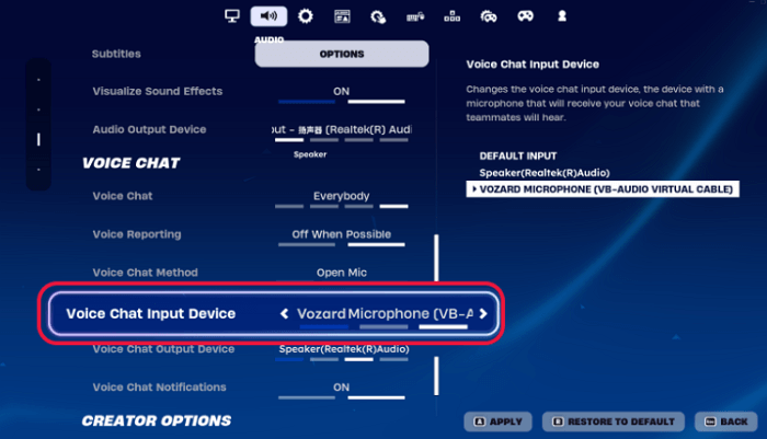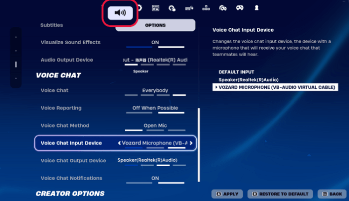 步骤 3.接下来,从“语音聊天输入设备”下拉列表中选择 Vozard 麦克风。