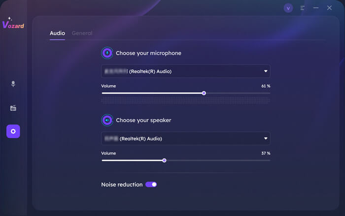 步骤1。在您的 PC 上打开 Vozard 并设置您的音频设备。为此,请单击左侧边栏上的“设置”,然后选择您的麦克风和扬声器。