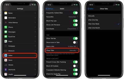 如果您仍然无法找到某些选项卡,请确保 Safari 在一定时间后不会代表您关闭它们: 打开设置,点击进入Safari -> 关闭标签页并确保手动被选中。