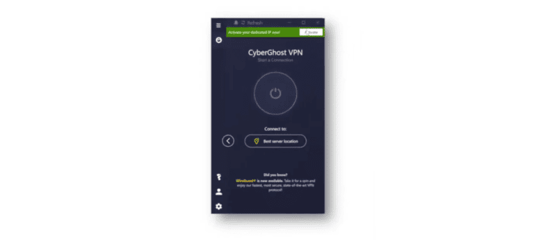 - 在您的首选设备上打开 CyberGhost 应用程序。你会发现一个绿色的通知栏,上面写着“立即激活您的专用IP!”