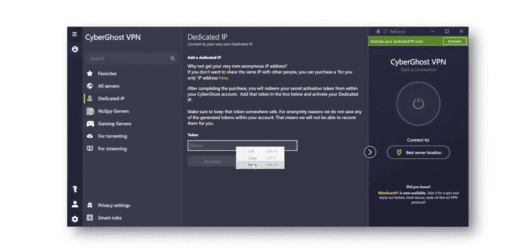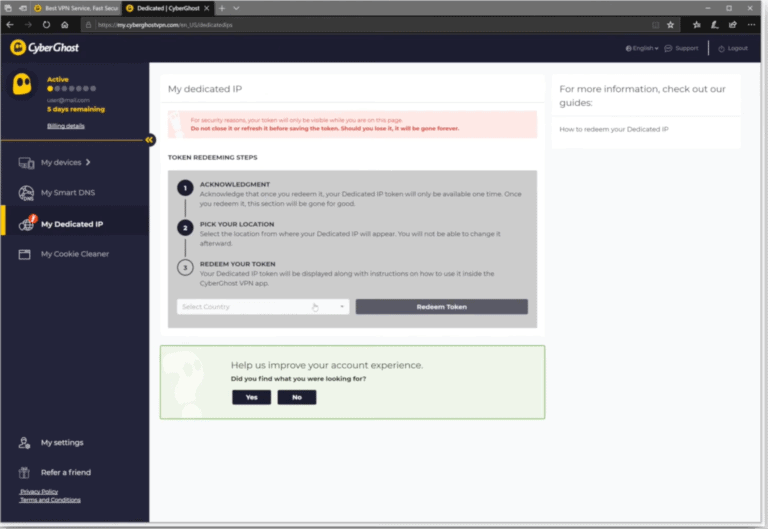 接下来,CyberGhost 允许您在 Windows、macOS、Android 和 iOS 上兑换和激活您的专用 IP 令牌。