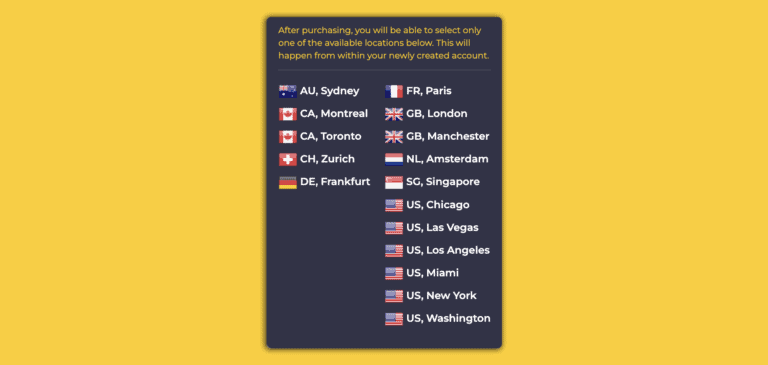 CyberGhost 提供的专用 IP 功能附带 IP 地址美国(6个地点),法国(1个地点),德国(1个地点),澳大利亚(1 个位置),荷兰(1个地点),新加坡(1 个位置),英国(2个地点),瑞士(1 个地点)和加拿大(2 个地点)。