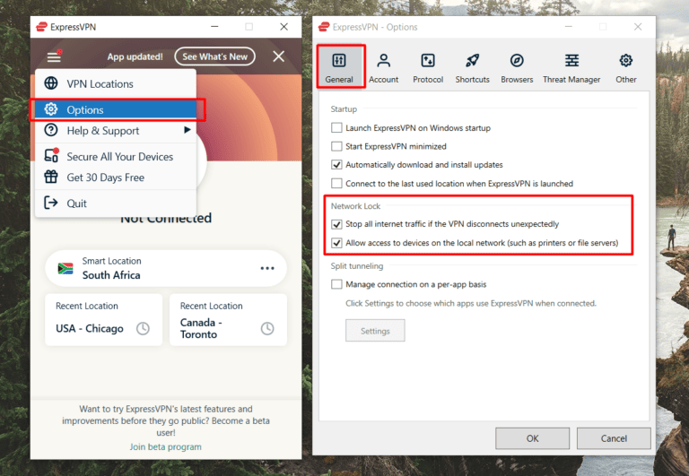 - 单击菜单图标和“选项” 启用网络锁定、VPN终止开关。点击 ”好的”。