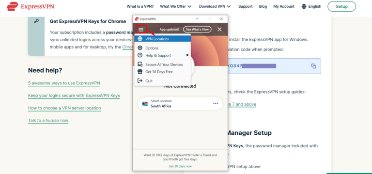 通过连接到提供商的南非 VPN 服务器,使用 ExpressVPN 获取南非 IP 地址。