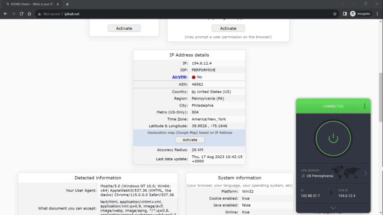 - 测试是否有泄漏。我用过www.ipleak.net并确认在费城拥有宾夕法尼亚州 IP 地址。