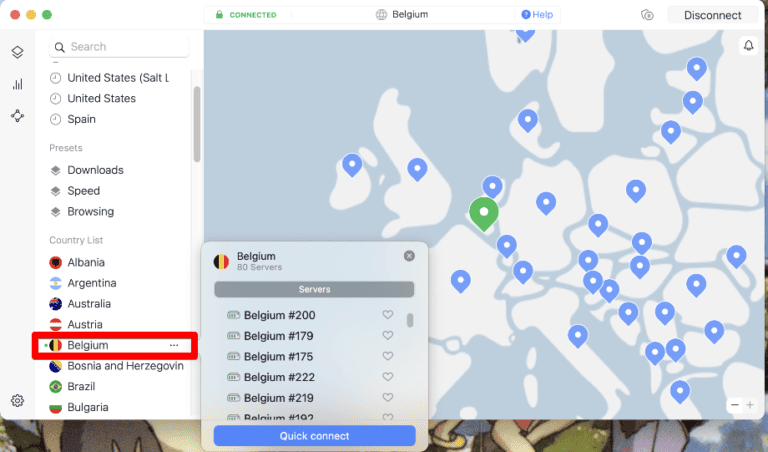 - 选择服务器位置(最好是您要访问的内容的位置)并连接。您还可以使用“快速连接”最近且最快的服务器选项。