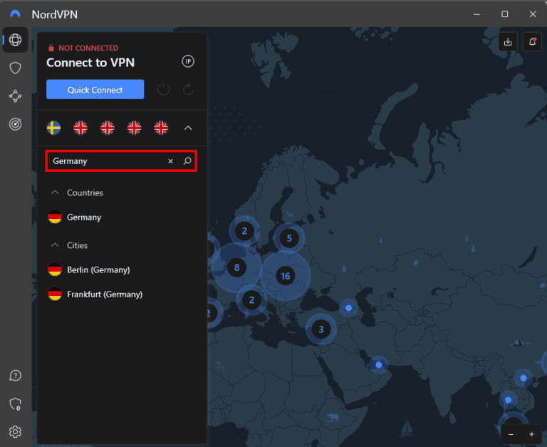 一般来说,德国最好的 NordVPN 服务器应该提供最低的 ping,最快的流媒体速度,并保证在线安全。前往快速连接访问德国最近/最快或最好的 VPN 确定的服务器。
