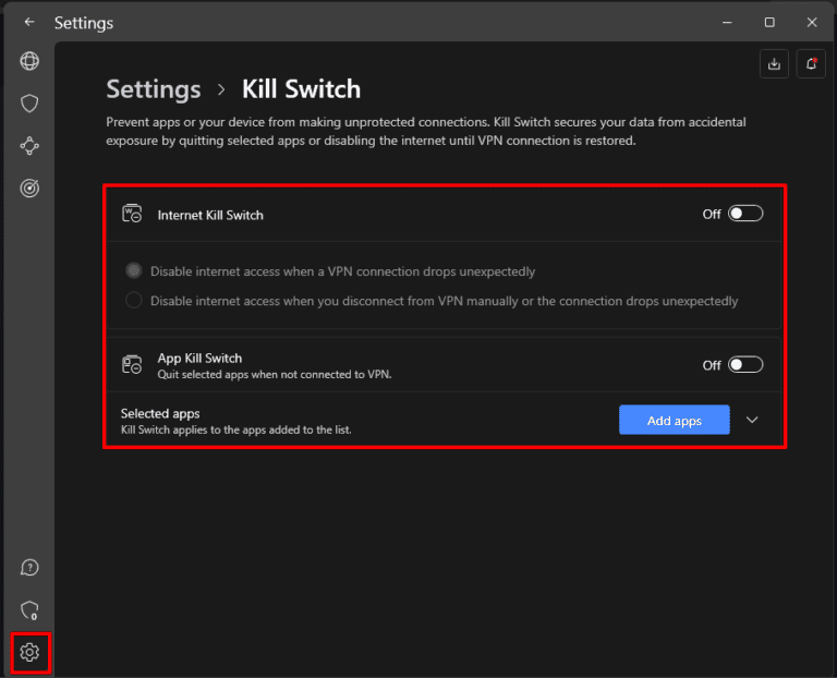 - 激活 NordVPN 终止开关,即使在 VPN 连接断开时也能保护您的互联网连接。经过设置>终止开关>互联网终止开关。