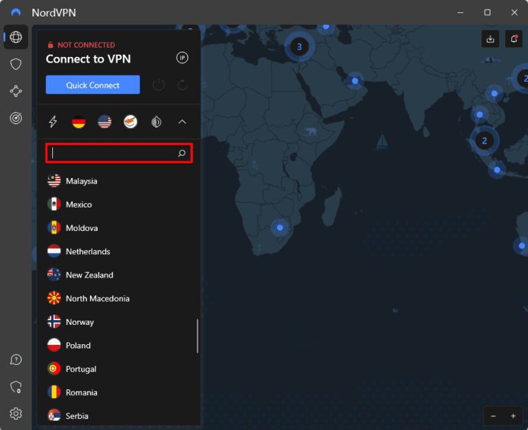 - 单击地球图标在左侧菜单面板中访问 NordVPN 服务器位置的完整列表。