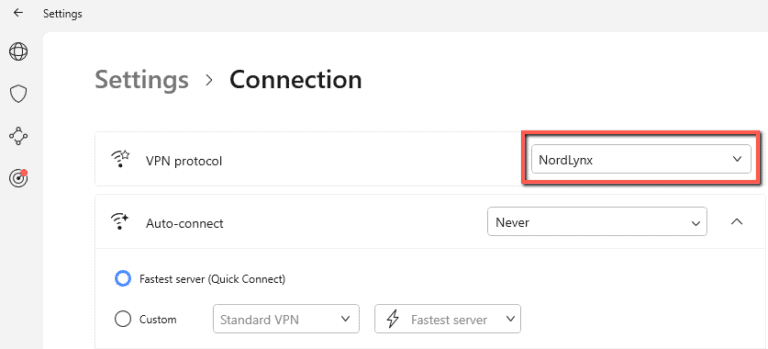 - 选择适当的协议。去设置>联系>VPN协议并选择Nordlynx。