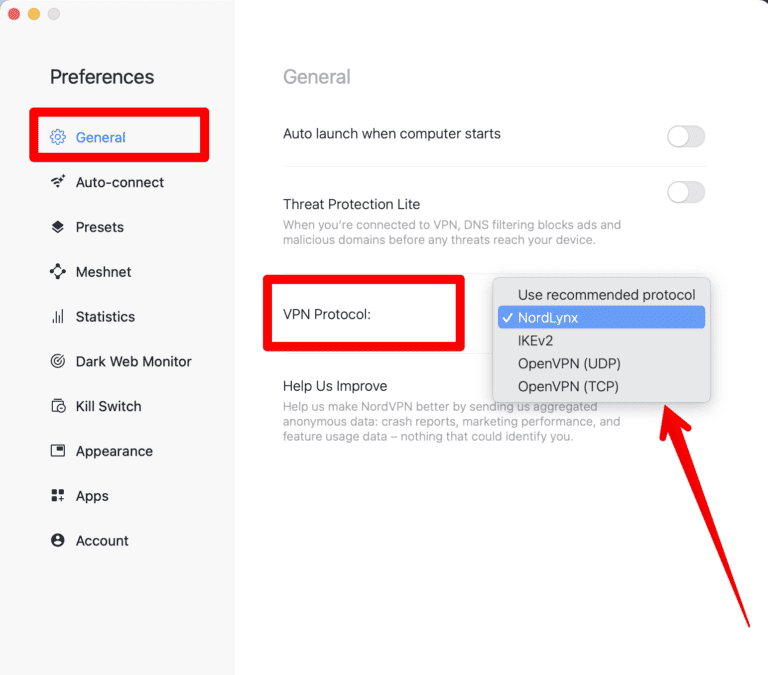 - 前往设置>一般的>VPN协议并选择一个协议。我推荐北山猫为了速度。