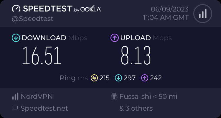 在我的速度测试中,NordVPN 的下载速度令人印象深刻16.51 Mbps。我的基线速度是25Mbps。