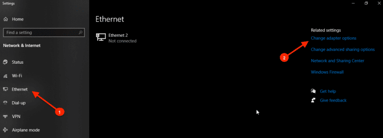 - 点击 ”以太网“ 进而 ”更改适配器选项”。