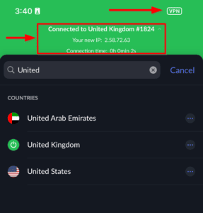 - 您的 NordVPN 应用程序现在应该可以通过 T-Mobile 网络成功连接到服务器。