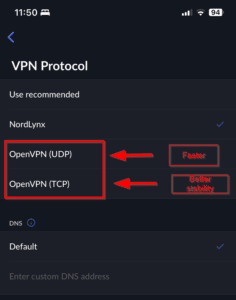 - 在“设置”中选择合适的协议。我推荐 NordLynx(基于 WireGuard),但 OpenVPN 有时是 T-Mobile 最稳定的选择。