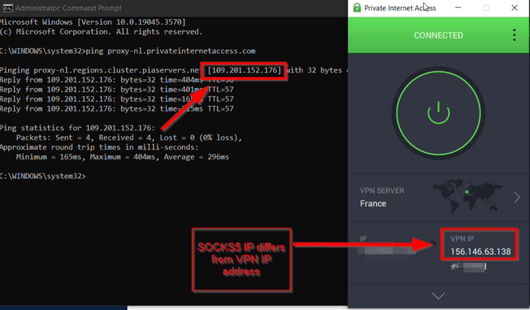 您可以通过连接到 PIA 服务器来获取唯一的代理 IP,然后再 ping 其 SOCKS5 地址以获取您的 IP 地址。