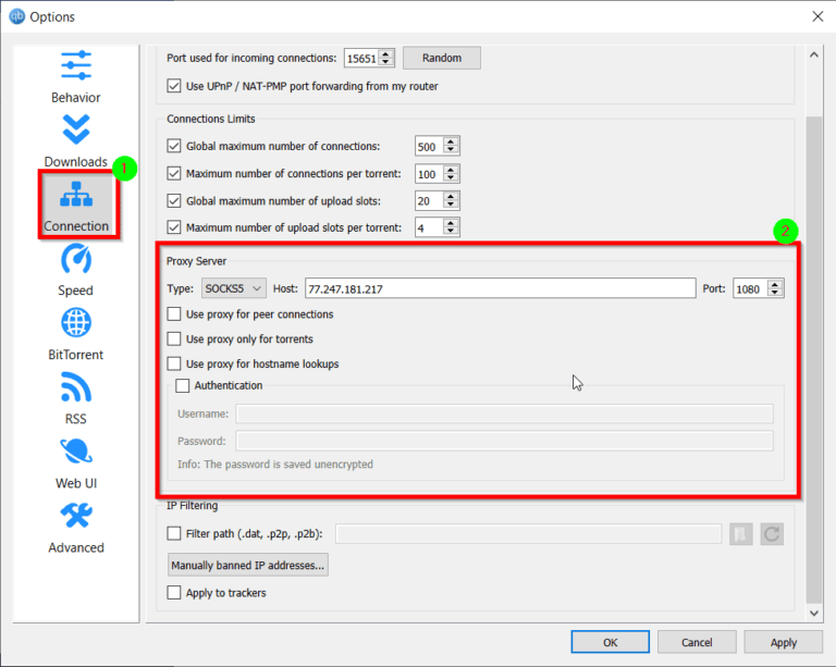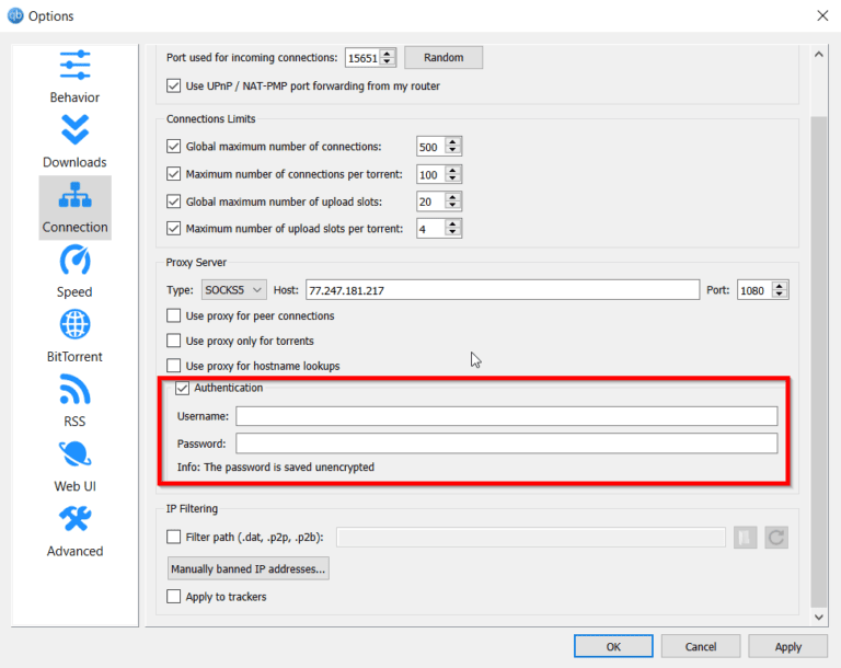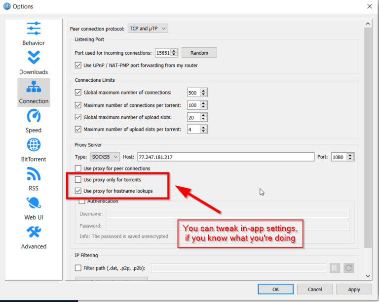 - 保存后,使用 SOCKS5 IP 地址和端口详细信息配置您的首选第三方应用程序。例如,下面的屏幕截图显示了 qBittorrent 中的设置位置。