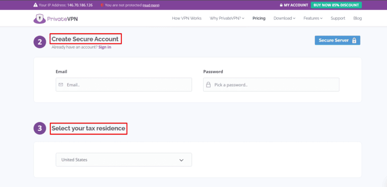 - 创建一个私人VPN帐户输入您的电子邮件地址和安全密码。此外,出于税收目的,请选择您所在的国家/地区。