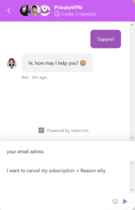 您可以通过您的 PrivateVPN 帐户申请退款,方法是填写支持票或通过其实时聊天选项与代理交谈。