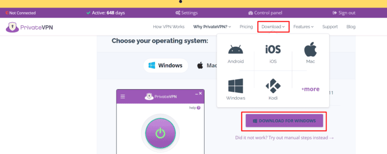 - 登录您的 PrivateVPN 网络帐户并点击“下载”。