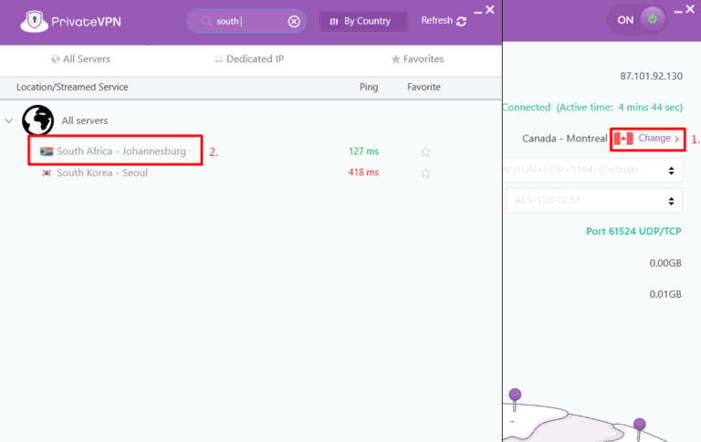 - 我点击了“改变” 在我的 PrivateVPN 上切换到南非服务器。