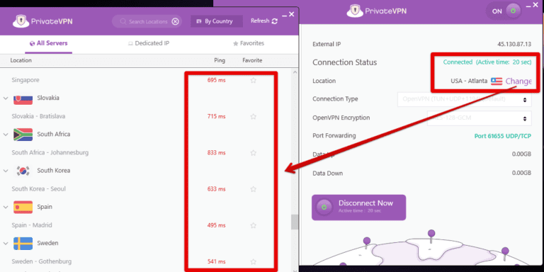我推荐个位数或者低两位数ping 服务器以获得最佳的 PrivateVPN 速度和功能。