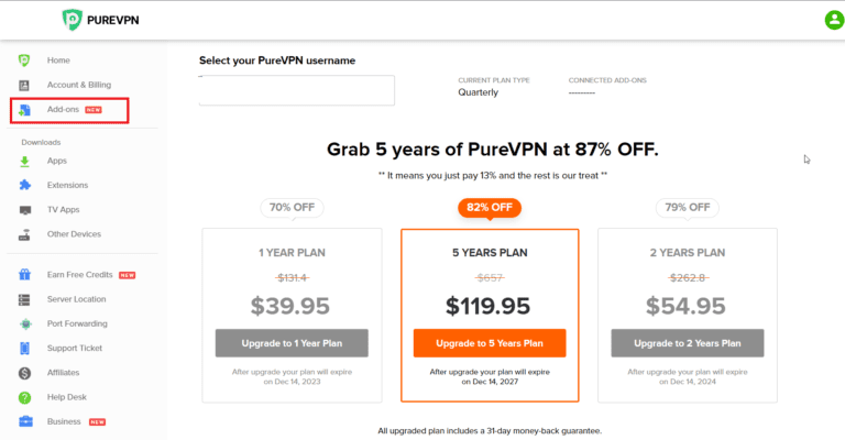 - 购买 PureVPN 计划。使用我们的折扣优惠,并选择多年期产品以获得最佳节省。