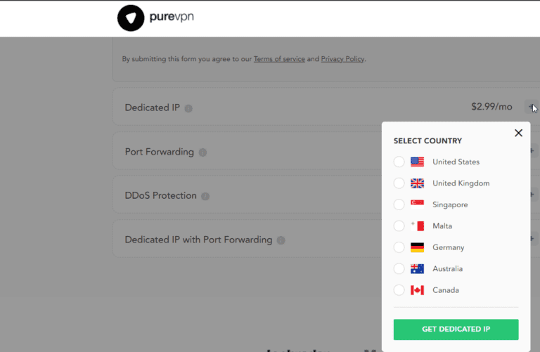 - 有限国家:您无法在任何您想要的国家/地区获得 PureVPN 专用 IP 地址。您的选择现在仅限于美国、英国、新加坡、马耳他、德国、澳大利亚和加拿大。而您可以通过基本 VPN 计划获得 70 多个国家/地区的服务。