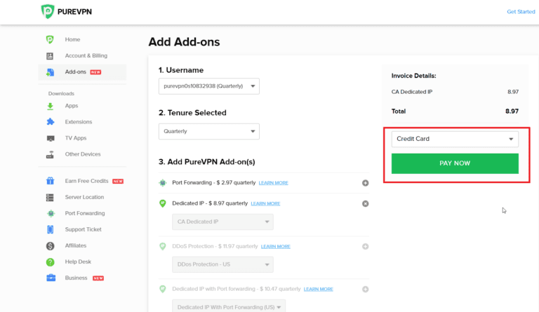 您可以通过在首次购买 VPN 时将其选择为附加组件来获取 PureVPN 的专用 IP 地址,或者如果您已经拥有 VPN,则可以从帐户仪表板中获取 PureVPN 的专用 IP 地址。