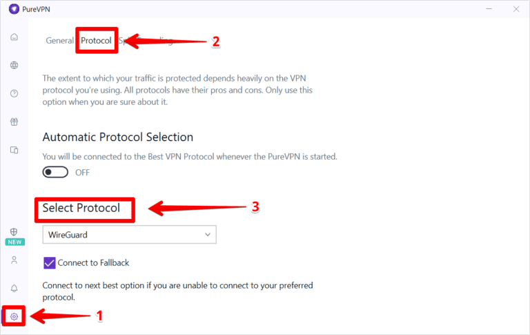 - 更改 VPN 协议:PureVPN 具有不同的协议,您可以使用它们来优化您的体验。如果应用程序出现问题,请在这些协议之间切换。