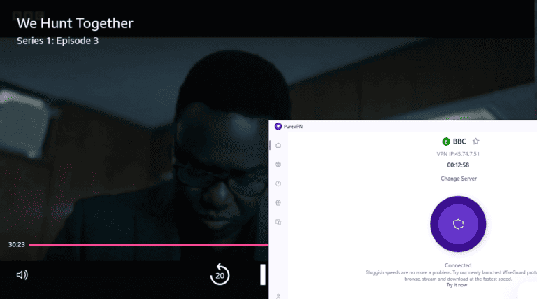 例如,我在默认的 PureVPN – BBC 服务器上以高清观看了《We Hunt Together》第一季,延迟和速度下降最小。