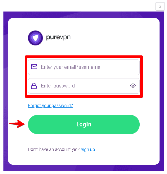- 安装 PureVPN 应用程序并使用您的凭据(用户名和密码)登录。