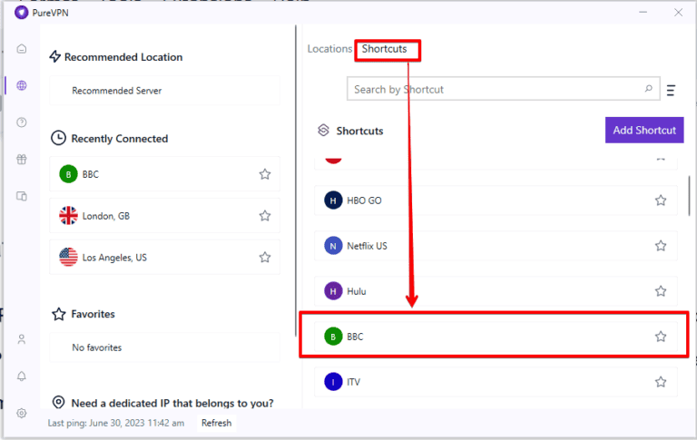PureVPN 提供两个英国服务器,伦敦和曼彻斯特,访问 BBC iPlayer。此外,VPN 还提供了一种特殊的英国广播公司快捷方式快速连接到 BBC iPlayer。