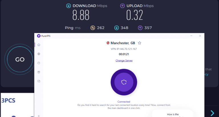PureVPN – London 服务器是最慢的,在 15Mbps 网络上的时钟速度为 3.35 Mbps。