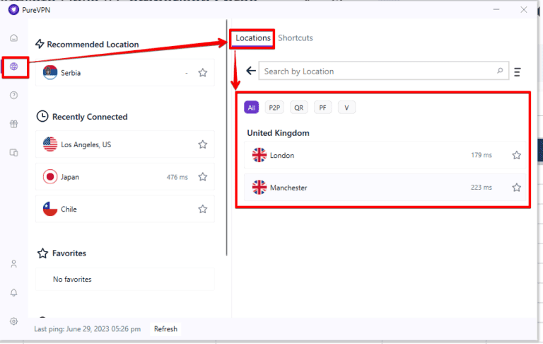 - 连接到位于曼彻斯特或伦敦的 PureVPNs UK 服务器。单击地球图标>地点>英国连接。