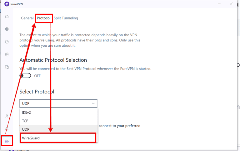 - 连接到适当的 PureVPN 协议。我推荐WireGuard协议其快速的速度和互联网的稳定性。要连接,请转至设置>协议>线卫。