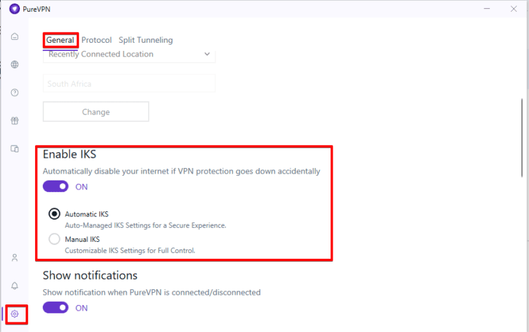 - 激活 PureVPN 终止开关,以便 Virgin Media 在 VPN 连接随机断开时不会跟踪您的真实 IP 地址和位置或窥探您的 P2P 在线活动。经过设置>一般的>启用 IKS。