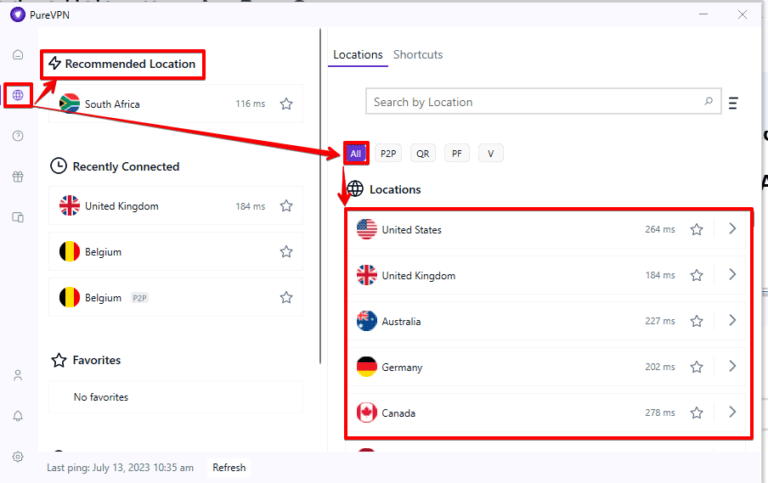 - 选择并连接到合适的 PureVPN 服务器。单击地球图标>推荐地点获取最快/最近的 PureVPN 服务器,或单击地球图标>全部访问 PureVPN 服务器的完整列表。