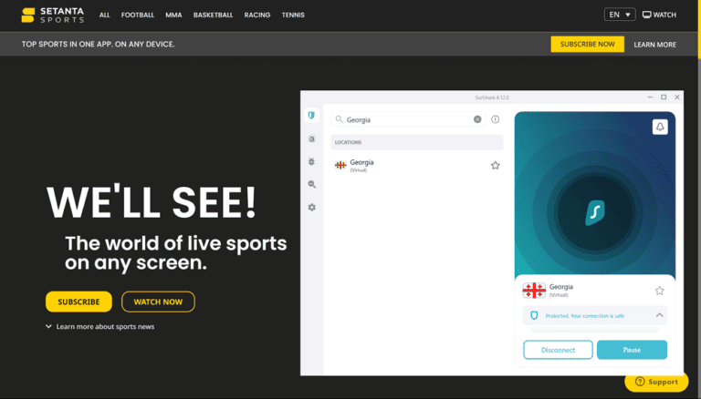 - 现在您已连接到 Georgian 服务器,您可以随时在 Setanta 上流式传输体育赛事。
