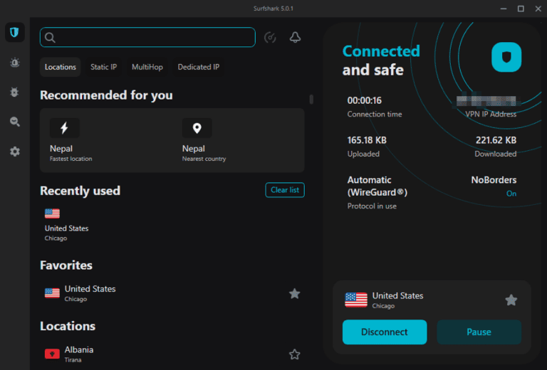 此外,Surfshark 的动态多跳服务器非常适合通过公共 Wi-Fi 访问您的伊利诺伊州中央银行帐户。我使用拉斯维加斯作为入口,芝加哥作为出口进行了多跳连接,并享受了快速的速度。