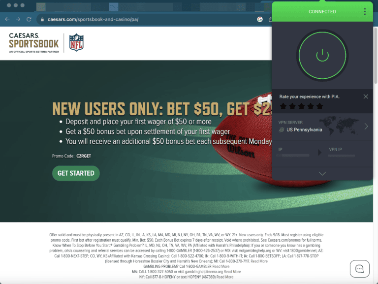 Private Internet Access 是唯一具有宾夕法尼亚州服务器的可靠替代 VPN。因此,如果您特别需要这些服务器,PIA 是最佳选择解锁 PA 赌博网站,如 Ceasar 和 BETMGM。