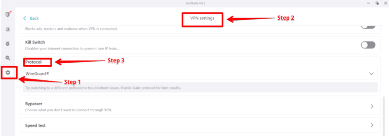 - 选择一个协议。我建议使用Vireguard,因为它非常安全并且不会损害速度。要激活它,请单击设置图标,导航到“VPN设置,“ 点击 ”协议,”并启用“线人。”