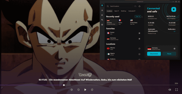 我使用 Surfshark 的法兰克福服务器和 WireGuard 协议来观看龙珠超在 Joyn.de 上。我喜欢无缓冲和全高清!您还可以观看电视现在为了独家德国内容。