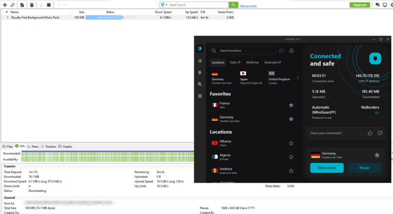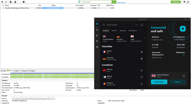 然而伦敦服务器的下载速度并没有超过2.5Mbps,并且花费了大约4分钟完成下载。因此,Surfshark 的法兰克福服务器是在德国进行种子下载的最佳服务器,无需通知 EasyBell 和 m-Net 等 ISP。