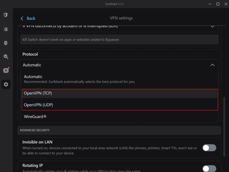 如果不需要,您可以随时在 Surfshark 应用程序的“设置”菜单中更改协议。