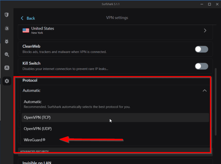 - 滚动到“协议,”切换下拉菜单,然后选择“线人。”这将使您最接近基本的互联网速度,以确保南非的VPN快速连接。