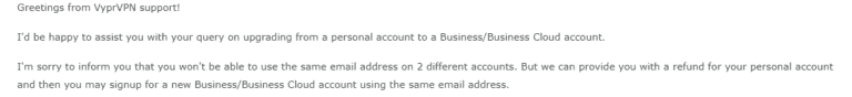 如果您已经订阅了 VyprVPN,但想要专用 IP,如果您仍然符合资格,您可以通过实时聊天联系 VyprVPN 的支持团队,以获得帐户退款。然后您可以注册商业专用IP使用不同的电子邮件地址的包裹。