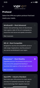 - 轻敲 ”协议”并选择“Chameleon™ – 最隐秘”。这是对中国来说最可靠的协议。