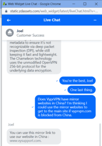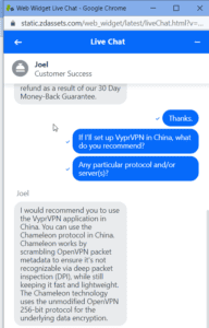 我与 VyprVPN 的客户支持人员进行了交谈,他们向我保证 Chameleon 协议是中国安全和隐私方面最好的协议。